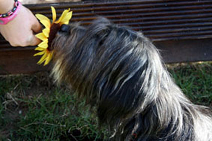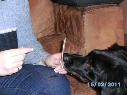Die Aufgabe war: Der Hund sollte mit der Nase »andocken«. Damit war gemeint, dass er die Nase für einen längeren Zeitraum (3 – 5 Sek.) an einen bestimmten Gegenstand drückt. Und das ist nicht so einfach wie es sich anhört. Probiert es mit Eurem Hund selbst mal aus. ;-)