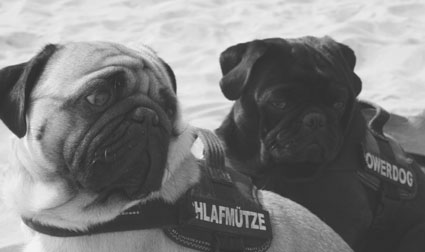 Kurzerhand mussten die Beiden etwas für ihren Urlaubsspaß tun und wurden vor den Karren gespannt. Grinsend gab ich den Befehl loszulaufen. Und nun raten Sie was passierte! Während ich mich schon freute an den Bollerwagen-Besitzern vorbei zu gleiten, weigerten sich Olek und Quinsy auch nur einen Zentimeter zu laufen. Muss man sich bei den Sturköpfen sonst bei jedem Spaziergang durchsetzen, dass Ziehen an der Leine nicht zum gängigen Repertoire eines Mopses gehört, gaben sie sich nun vorbildlich. Keine Spur vom »Powerdog«!