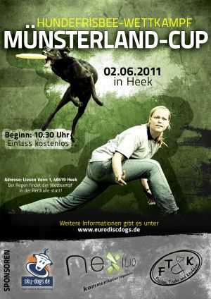 Am kommenden Donnerstag findet der Münsterland Cup statt. Veranstalter sind die Eurodiscdogs. Diese richten Wettkämpfe nach einem eigenem Regelwerk aus, das an die UFO-Regeln angelehnt ist. Der Schwerpunkt liegt im Freestyle und Punkte beim Minidistance fließt nur mit einem geringen Teil in die Bewertung ein. Das schonende und gesunde Spielen mit dem Hund steht immer im Vordergrund.