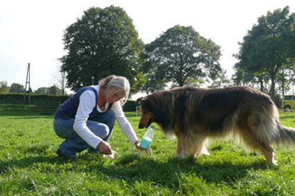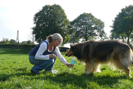 Die Collie-Dame Laika plaziert gekonnt den Ring über eine Flasche.